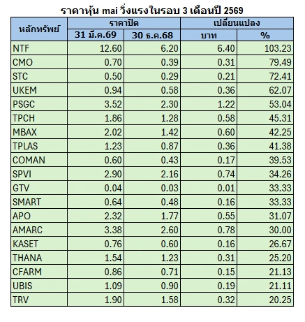 สำรวจหุ้น mai ช่วง 3 เดือนแรกปี 2569 พบ 19 หลักทรัพย์ให้ผลตอบแทนเกิน 20% แกร่งกว่าดัชนี mai ขยับขึ้นเพียง 0.50% โดย NTF นำทีมพุ่ง 103.23% ตามด้วย CMO, STC และ PSGC